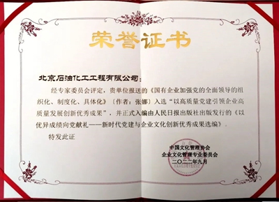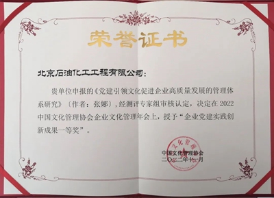 北京石油化工工程有限公司榮獲“黨建強(qiáng)企優(yōu)秀案例一等獎(jiǎng)”。另外,公司黨委申報(bào)的2021年度和2022年度兩篇黨建和企業(yè)文化研究成果獲獎(jiǎng):《黨建引領(lǐng)文化促進(jìn)企業(yè)高質(zhì)量發(fā)展的管理體系研究》榮獲“企業(yè)黨建實(shí)踐創(chuàng)新成果一等獎(jiǎng)”;《國(guó)有企業(yè)加強(qiáng)黨的全面領(lǐng)導(dǎo)的組織化、制度化、具體化》入選“以高質(zhì)量黨建引領(lǐng)企業(yè)高質(zhì)量發(fā)展創(chuàng)新優(yōu)秀成果”,并正式入編由人民日?qǐng)?bào)出版社出版發(fā)行的《以?xún)?yōu)異成績(jī)向黨獻(xiàn)禮——新時(shí)代黨建與企業(yè)文化創(chuàng)新優(yōu)秀成果選編》。
