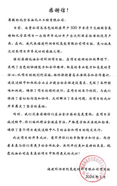 近日,北京石油化工工程有限公司收到福建科潤世紀氫能材料有限公司發(fā)來的感謝信,對我公司在負責配套年產500平米質子交換膜含氟精細化學品項目期間,出色的協調能力和合作精神,極高的專業(yè)能力和高度的責任心給予了高度評價。